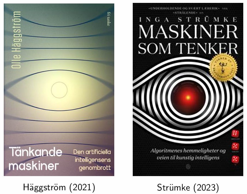 I am nowhere near having the analogous position in Swedish AI discourse, so in this respect Strümke has been markedly more successful than me. And as the reader will soon find out, there are major differences in how we think about AI. But there are also some similarities between us, including the odd coincidence that within a time span of just two years, we have both published books about AI with almost the same title, and strikingly similar Orwellian-inspired cover images.